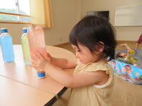 色水コーナーでは、お花紙をびりびりと割いて、水の入ったペットボトルに、ぎゅっぎゅっとつめました。それ