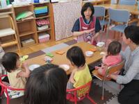 た。今回は、2組の親子が遊びに来ました。「色」を感じて楽しめるコーナーを準備しました。