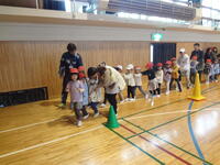 自己紹介や呼名が終わった後は、プールでの活動を行いました。普段とは違う大きなプールに、「大きい!」子ども達からは歓喜の声が上がっていました。友達が泳いでいる様子を見て真似をしてプカプカ泳ぐなど、他校の友達とみんなで水遊びを楽しむことができました。