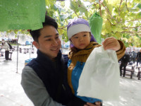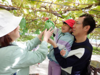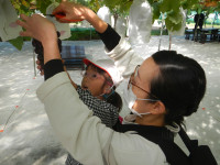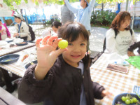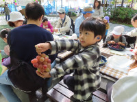 天気は、とってもさわやかな快晴で絶好の遠足日和となりました。ぶどう狩りは市内にある「まるよし観光果樹園」で行いました。事前にぶどうの色について「紫がいい!」「緑が好き!」「赤いぶどう食べてみたいな。」「(まるよし果樹園の)おじさんに会いたいな。」などやりとりをしながらとても楽しみにしていた子どもたち。果樹園のおじさんの丁寧な説明を真剣に聞き、ママやパパと一緒にはさみで「チョキン!」と切り落とした時の表情は充実感にあふれていました。親子で取り立てのおいしいぶどうをおなか一杯食べて、素晴らしい体験となりました。